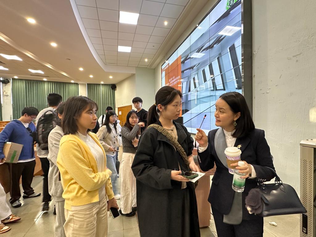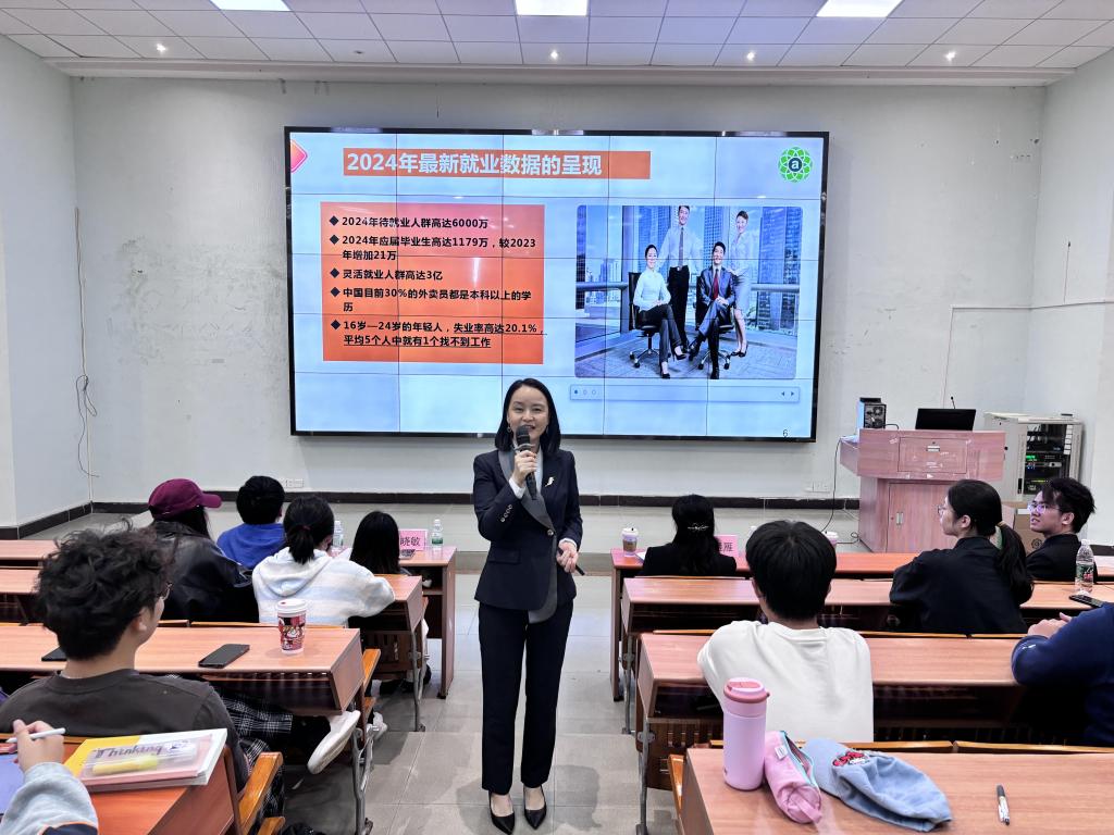 Ms. Zou Yanping began the lecture by interacting and engaging with the students. She then analyzed the employment market trends of the past five years, emphasizing the importance of workplace competitiveness and early career planning. Regarding career planning, she guided students in self-assessment, helping them recognize their strengths and weaknesses while clarifying the role of interests, abilities, and aspirations in career choices. She encouraged students to strive for higher GPAs, obtain professional certifications, and actively participate in social practice and internships to enrich their experience and resumes.