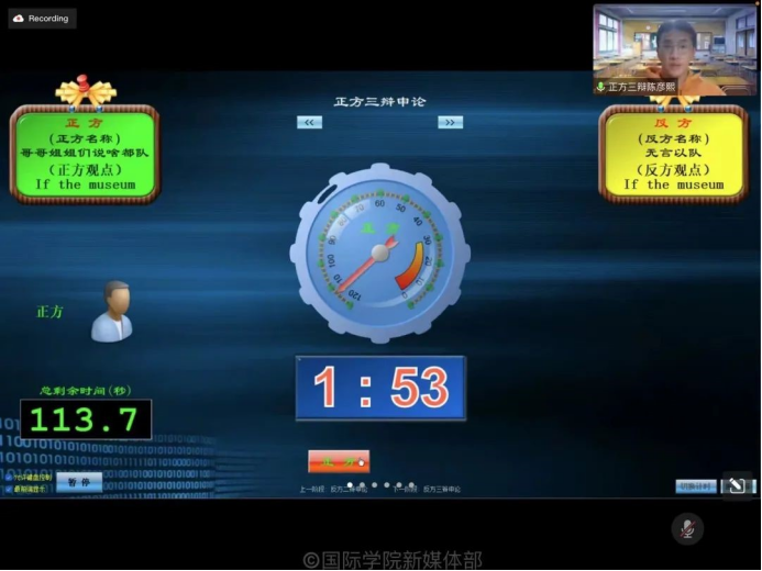 In the final stage, debaters centered around the topic: “if a museum catches fire, a famous painting and a cat, you can only save one. which one will you save?”. The pro side supported “If the museum catches fire, save the cat”. Their main points are: the greatest value of life is living, while saving the cat is a better manifestation of lifes value. But the con side stated that if the museum catches fire, save the painting”. Their main points are: the value of art does not only exist in the person who creates the art, but also is reflected on those who have respected and protected the art from generation to generation.