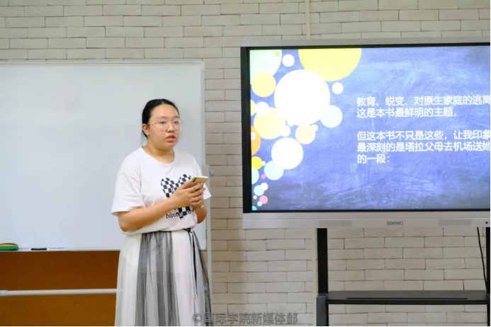 The third candidate He Meixuan, majoring in Accounting of the International Class of Grade 2022, shared the book Educated. She said that the most salient themes of the book were education, transformation and family origin, with the growth story of protagonist Tara whose parents taking her to the airport. In this regard, she believed that the problem between people and their family origin is complicated, and the relationship between children and parents is always interweaving and mutually influenced