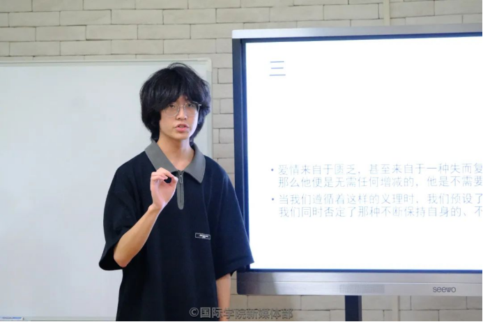 The second candidate Lu Yunzhi, majoring in English of the International Class of Grade 2022, shared the book The Art of Loving. The book contains a philosophical thought: each person is an individual, and self-value doesnt depend on anyones evaluation. In addition, he pointed out that the book contrasts love with physical passion, but ignores ethics as a higher dimension. Finally, he told that each person could get love experience through himself.