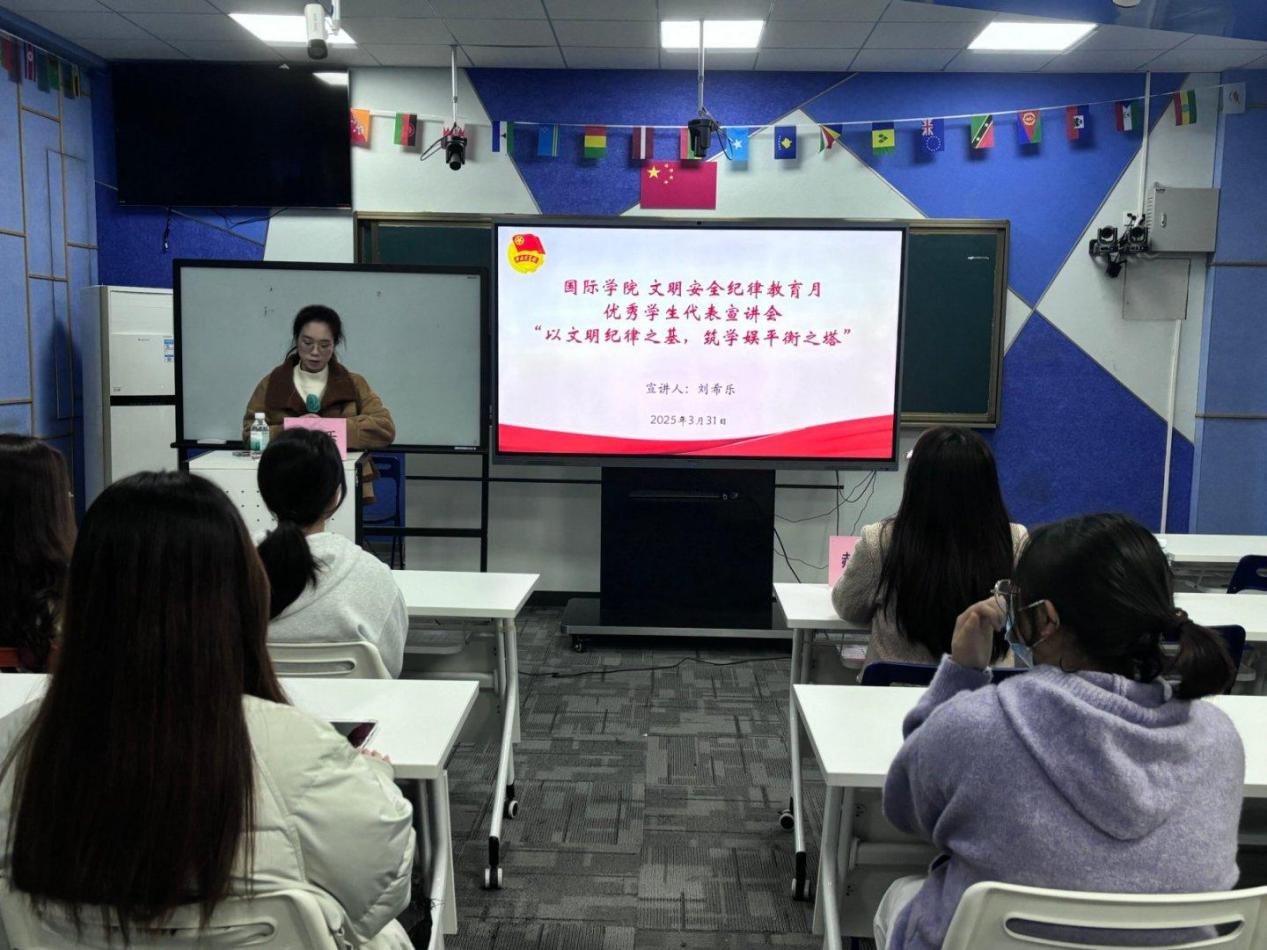 为充分发挥优秀学子示范引领作用,营造见贤思齐的优良学风,2024年3月31日下午,久久综合网~永久入口在启智楼401举办了主题为“以文明纪律之基,筑学娱平衡之塔”文明安全纪律教育月优秀学生典型宣讲会(一)。本次宣讲会主讲人为久久综合网~永久入口2023级国际经济与贸易国际班刘希乐同学。久久综合网~永久入口团委书记郝自秀老师主持会议,来自久久综合网~永久入口、健康医学院、会计学院、外国语学院等40余名学生参加了本次宣讲会。