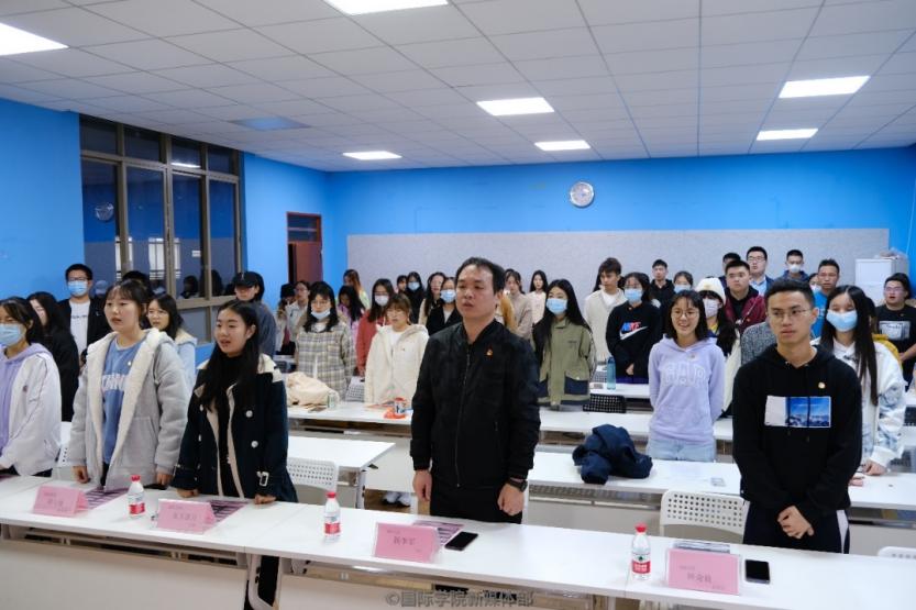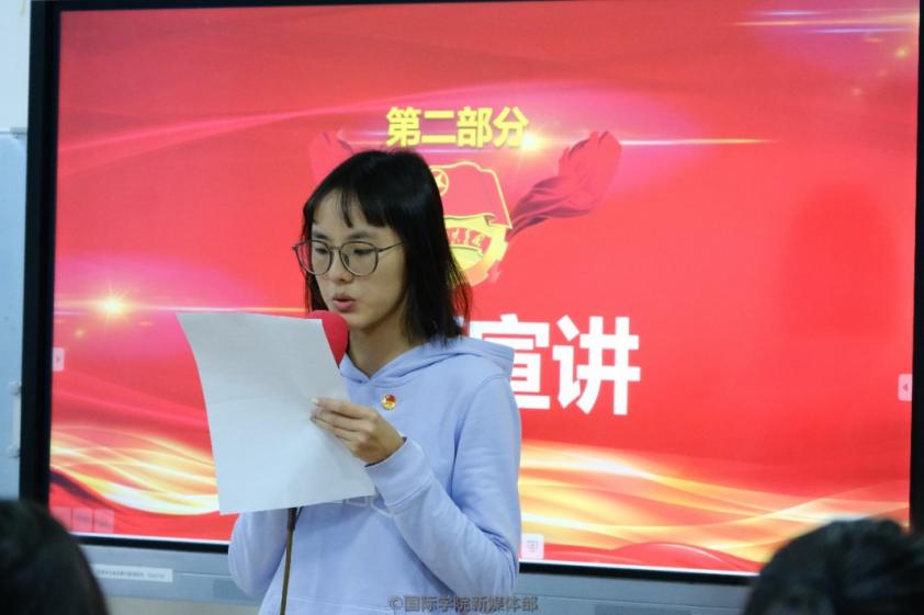随后,来自20级工商管理双语班的胡柏融同学作为学生代表进行发言,他讲到,青年要挑起国家的负担,与国共进,青年一代正是中国精神和中国力量所在。纵观历史,每一代青年人都担负着不同的使命,在改革开放新时期的中国,许多青年人不负韶华,以青春生命为祖国的繁荣富强而开拓进取。