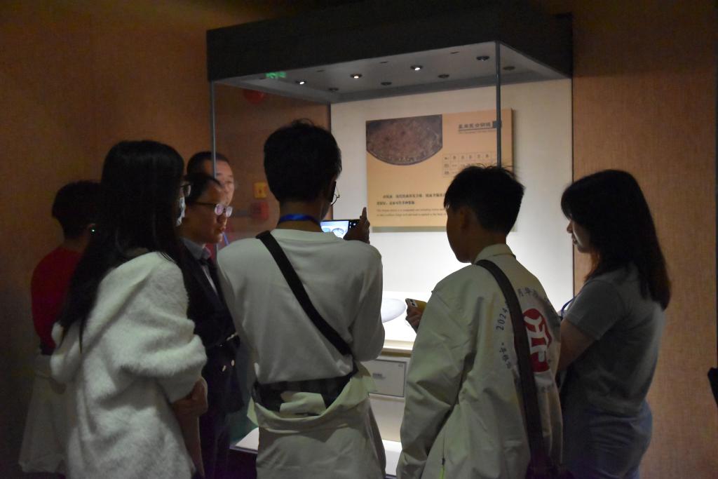 首先,他们抵达了广州南越王博物院的王墓展区,这座博物院承载了广州千年历史,横跨秦汉两朝。在讲解员的带领下,师生们在王墓区和展馆之间穿梭,通过欣赏彩色汉墓、汉代玉器、青铜器,深入了解了玉器文化以及中原文化与岭南文化的交汇融合;通过欣赏船纹铜提筒,领略了岭南文化元素里中西文化交融的特点及对外贸易的繁盛;通过犀角形玉杯的精湛工艺,体会到岭南人民在传统手工艺传承中的努力和贡献。这里近1000件展品,每一件展品都诉说着古老的故事,讲述着广州千年商都的历史。