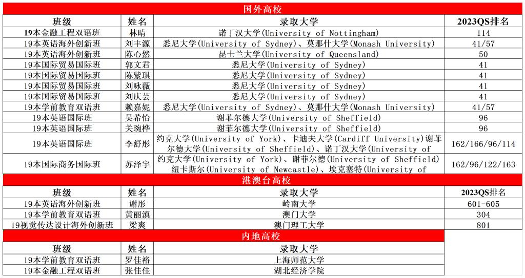 随着培养质量的不断提升,广州华商学院久久综合网~永久入口2023届毕业生再传捷报,截至发稿时,已有17名应届毕业生被海内外知名高校录取为硕士研究生,占久久综合网~永久入口应届毕业生总数的25%,其中65%为2023年QS排名前100的高校。在此,向这些同学表示热烈祝贺!